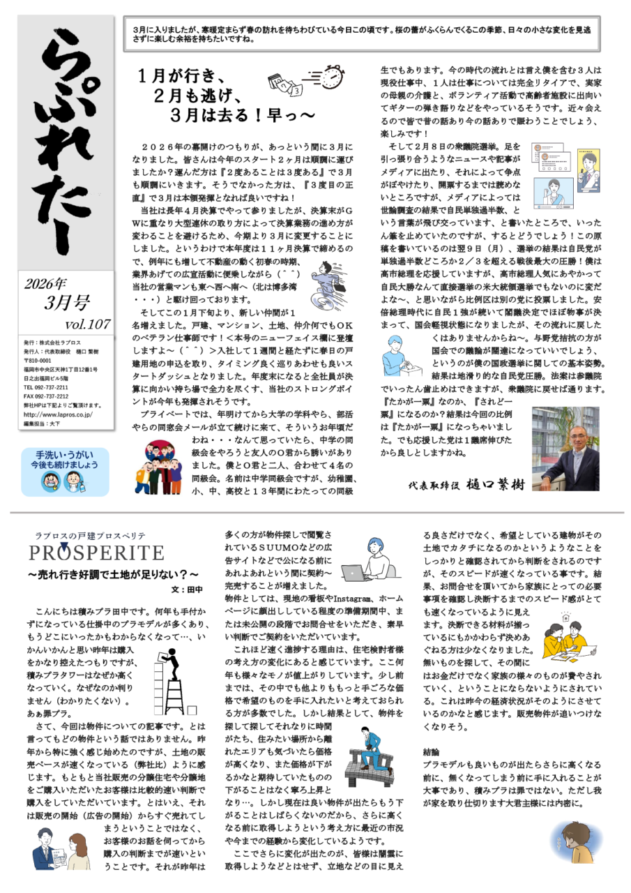 - 代表ご挨拶「1月が行き、2月も逃げ、3月は去る!早っ~」